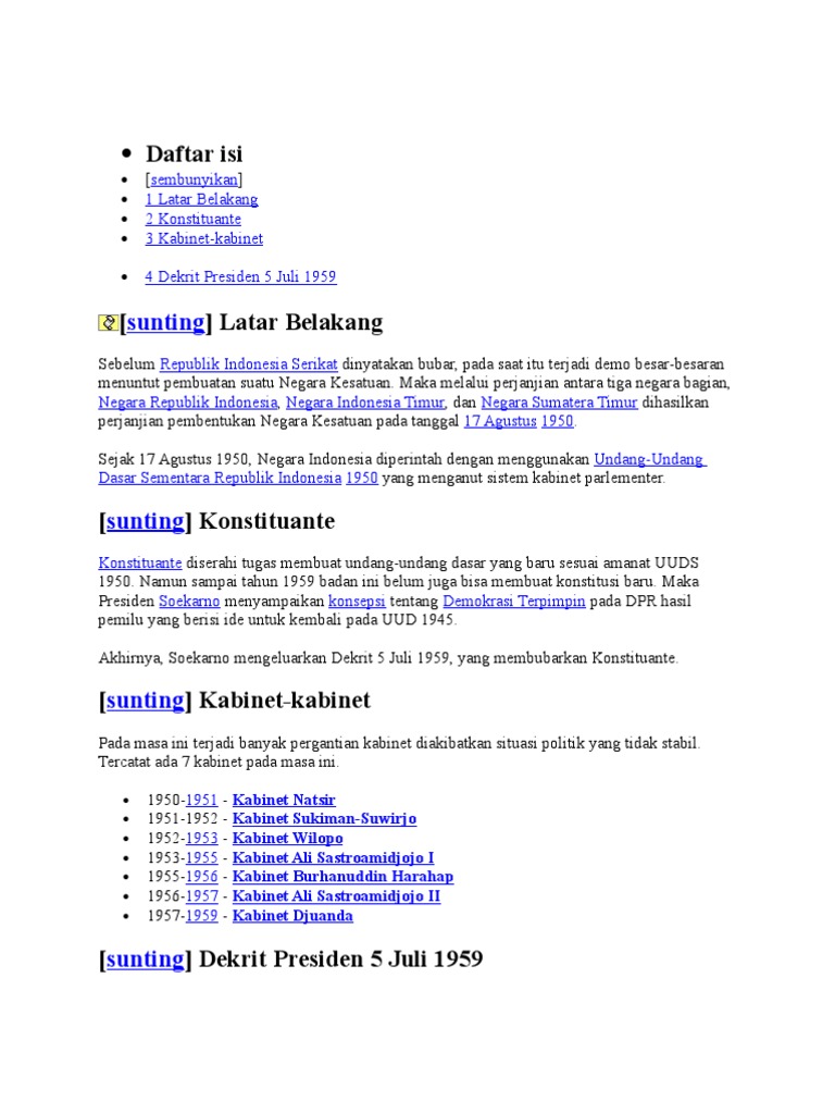 Infografik Mozaik Inti Dekrit Presiden 5 Juli 1959. Isi Dekrit Presiden 5 Juli 1959. Kegagalan tersebut disebabkan oleh adanya perbedaan pendapat dalam anggota dan konstituante sehingga tidak dapat menghasilkan kesepakatan bersama.